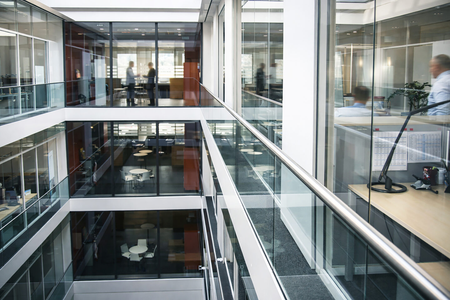 Der Neubau sollte ein Haus der Kommunikation werden. Für 400 Mitarbeiter wurde eine moderne Arbeitswelt mit Auditorium für 225 Personen, 25 Besprechungs- und Schulungsräume,